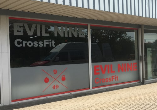 Die Fensterbeschriftung des Evil Nine Fitnessstudios zeigt, wie werbewirksam ein Sichtschutz sein kann...
